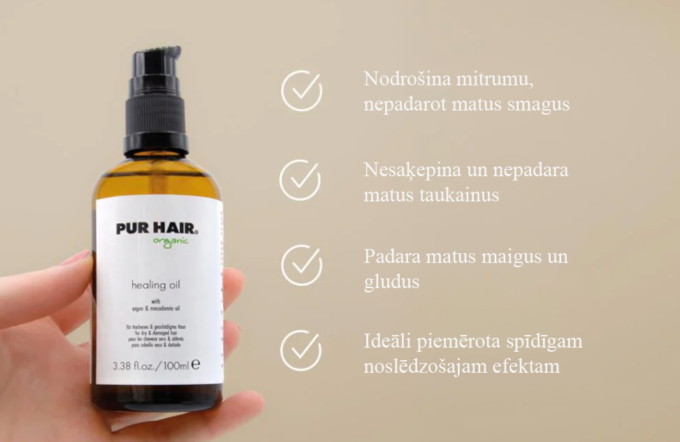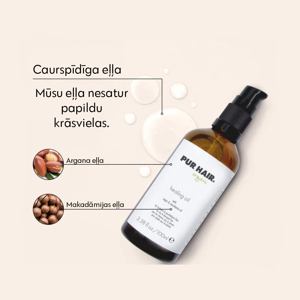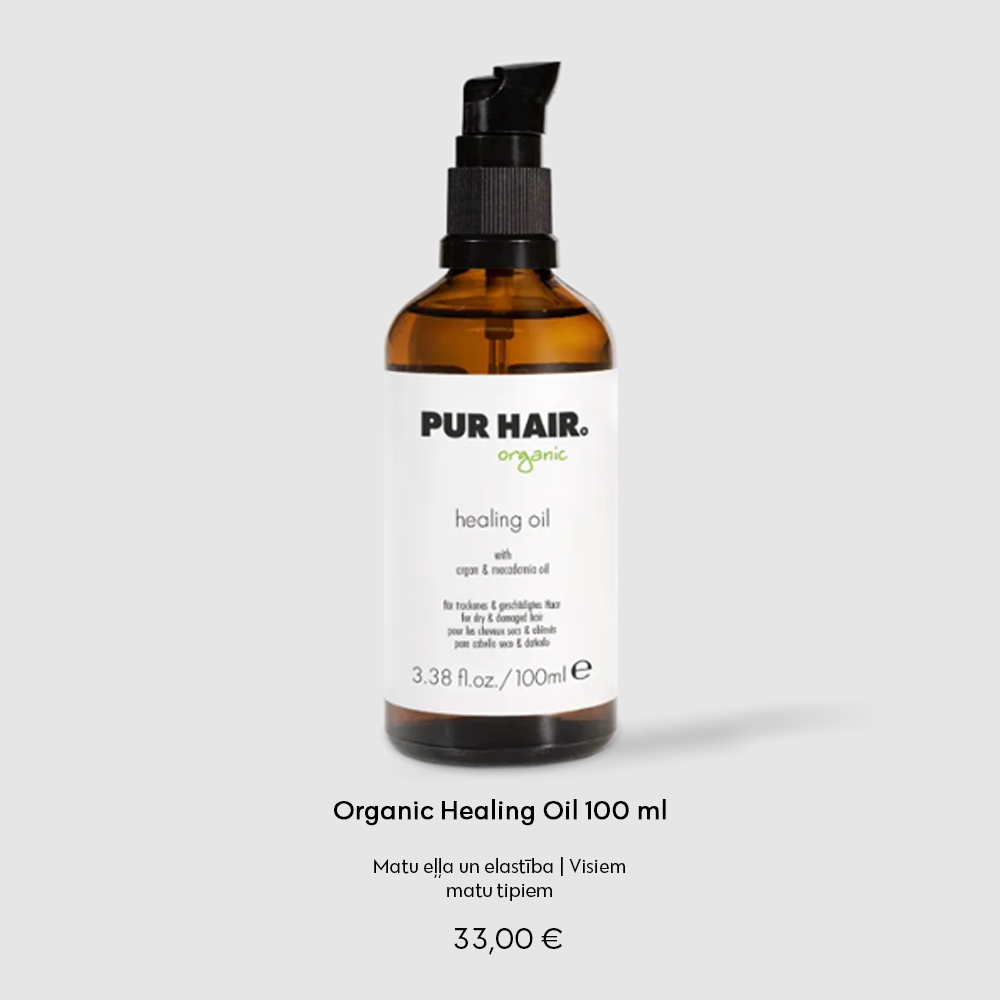 Mūsu PUR HAIR Organic Healing Oil sastāvā ir vērtīgās argana, kviešu asnu un makadāmijas eļļas, kas apvienotas ļoti efektīvā, ultraviegli uzklājamā formulā, kas padara matus ne tikai samtainus un spīdīgus, bet arī piešķir tiem brīnišķīgu siltas vaniļas aromātu.